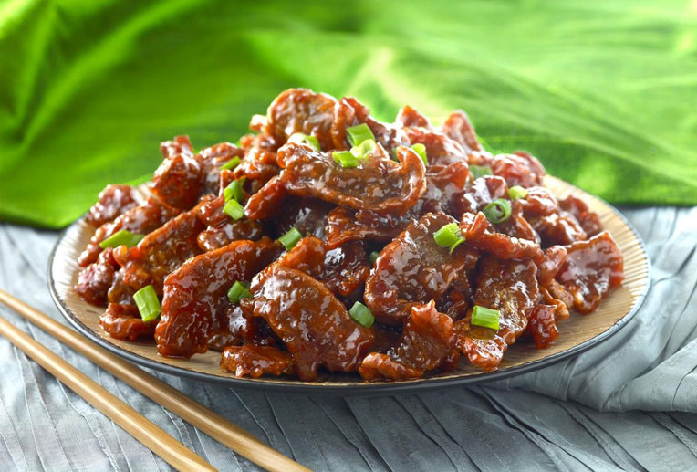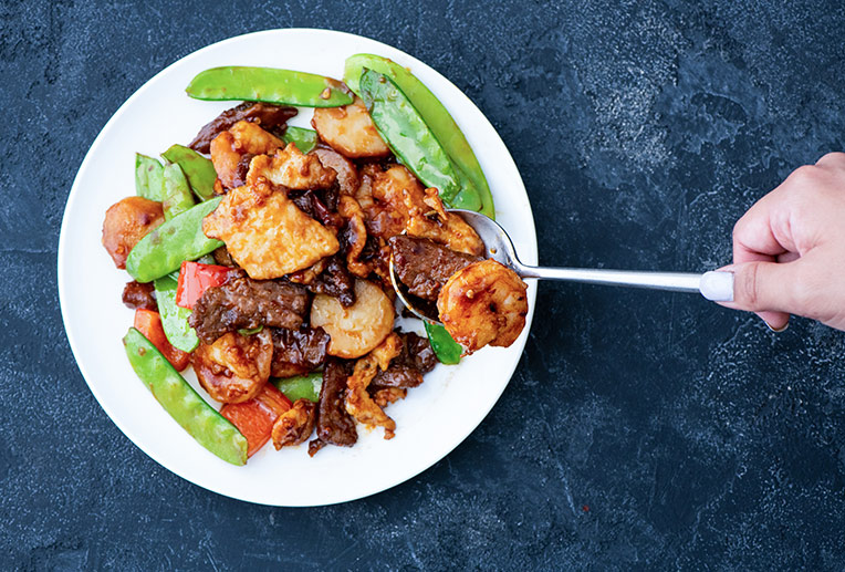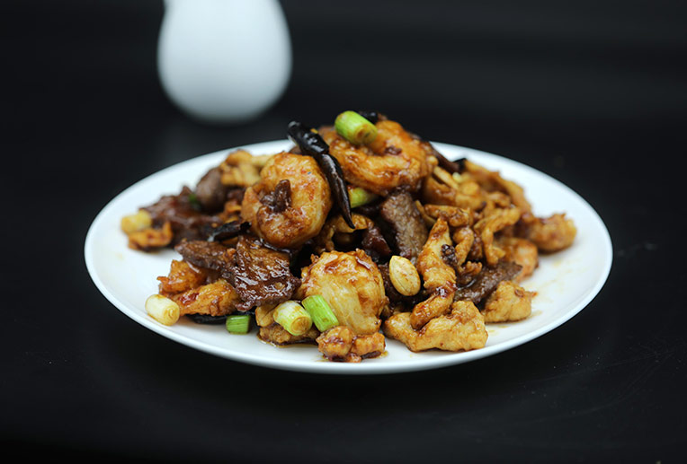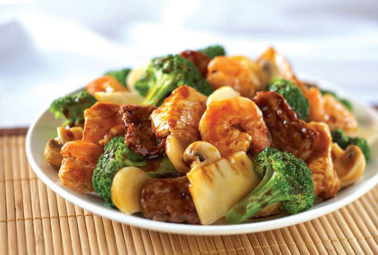 Tasty medley of shrimp, tender beef, chicken breast, fresh broccoli, mushrooms and bamboo shoots in a mushroom soy sauce.