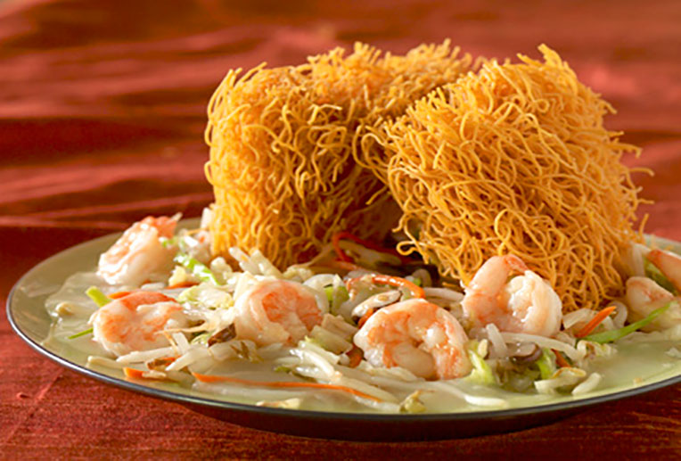 Hong Kong thing crispy egg noodles with Napa cabbage, mushrooms, snow peas, bean sprouts and carrots in a Shao Xing wine sauce. Choice of chicken or shrimp.